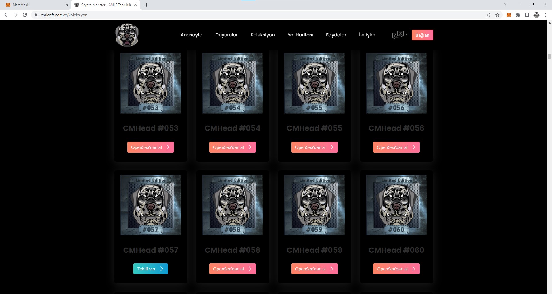 Bu bölümde “Teklif Ver” olarak mavi butonlu gördüğünüz NFT’ler başka bir topluluk üyesi tarafından alınmış demektir. Siz ilk aşamada alım yapmak istiyorsanız “OpenSea’den Al” butonuna tıklayarak almak istediğiniz NFT’ye tıklayın. Örneğimizde CMHead #056 numarayı almak istiyoruz ve ona tıklıyoruz.