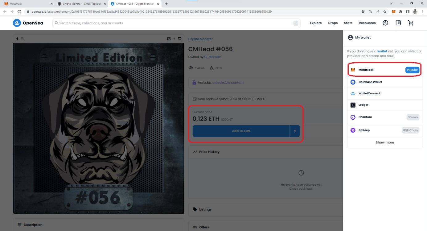 Bu seçimi yaptıktan sonra OpenSea yönlendirmesiyle direkt olarak almak istediğimiz NFT karşımıza çıkacak. Daha önce Metamask cüzdanınız ile OpenSea’ye giriş yapmadıysanız Add to Cart seçeneği gözükecektir. Bu Butona tıkladıktan sonra sağ taraftan bir cüzdan bağlamanızı isteyecekleri ekran açılır. Oradan Metamask seçiniz ve devamında sizden kayıt işlemleri için imza butonlarına basmanız istenir. Bu aşamaları tıklayarak geçiniz.