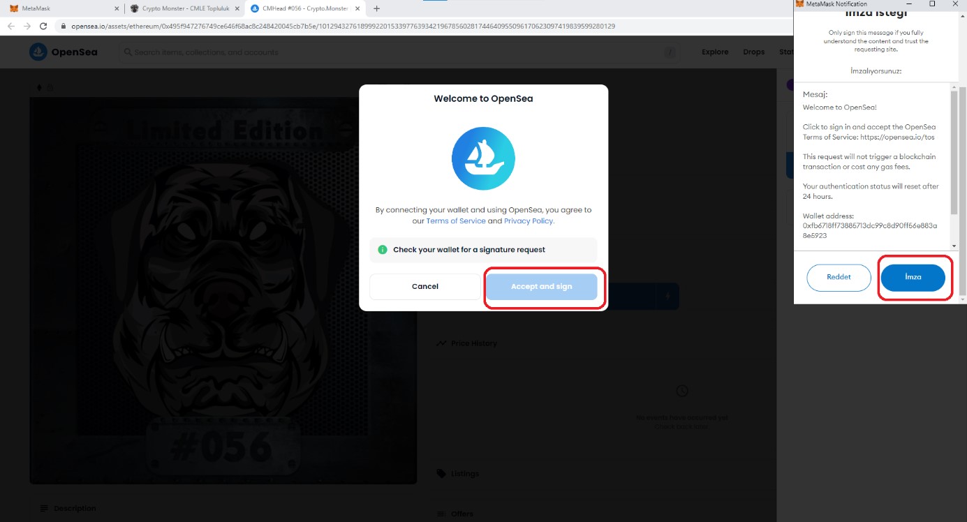 Aşağıdaki görselde olduğu gibi “Accept and Sign” butonuna tıkladıktan sonra sağ taraftan Metamask eklentisi açılarak birde bunu blockchain üzerinden imzalamanız istenir. İmza butonuna basarak devam ediniz.
