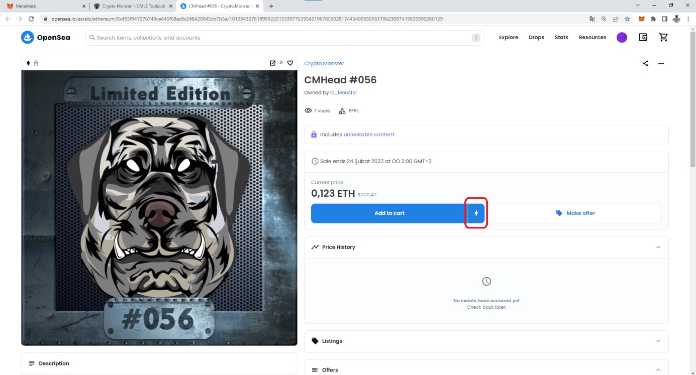 OpenSea kaydınız gerçekleştikten sonra tekrardan CMHead #056 veya sizin seçmiş olduğunuz bir numaranın ekranında olacaksınız. Farenizin imlecini şimşek butonun üzerine götürdüğünüzde “Buy Now” a dönüştüğünü göreceksiniz. Buna tıklayarak devam ediniz.