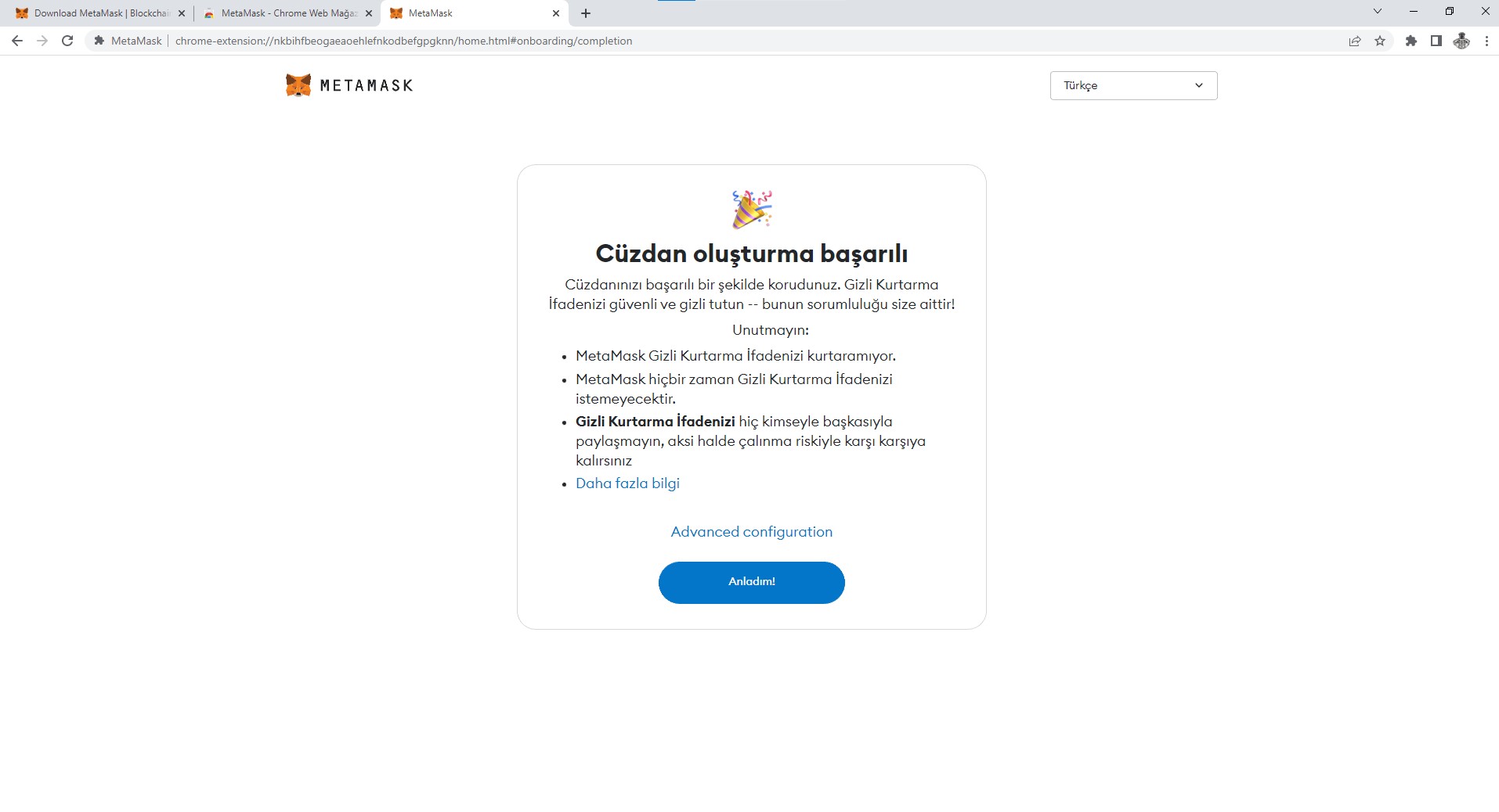 Chrome’a ekle dedikten sonra cüzdan kurulumu gerçekleşir.