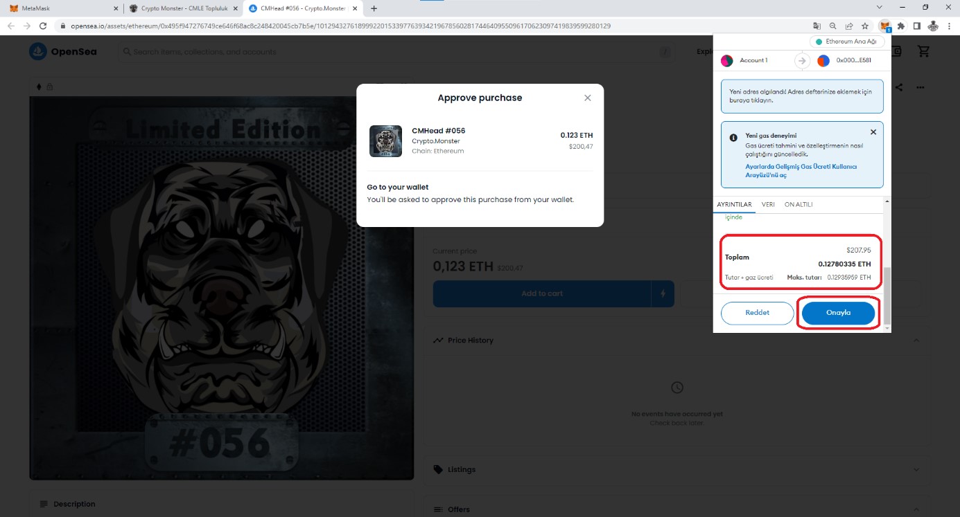 Alımı gerçekleştirmek için Blockchain üzerindeki sözleşmeyi onaylamak gerekir. Görselde görüleceği üzere mevcut alım zamanındaki Gas Fee hesaba katılarak toplam ödenecek tutarı ETH ve USDT cinsinden görüntülenerek onayınıza sunulur. “Onayla” butonuna basarak seçtiğiniz NFT’ye sahip olabilirsiniz.