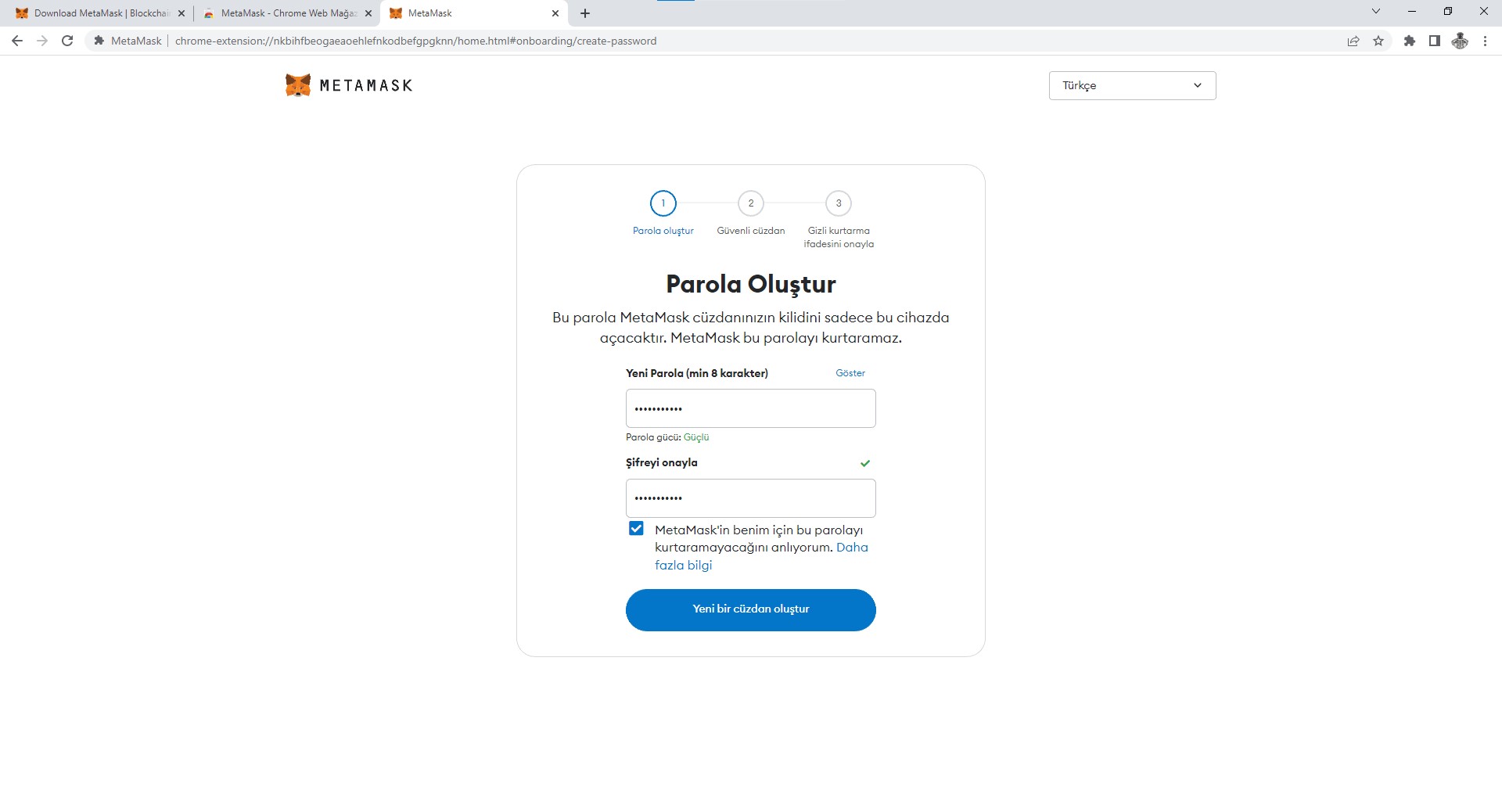 Karşınıza cüzdan oluşturmanın ilk adımı olan “Parola Oluştur” kısmı gelecek. Buradaki parolanızı bir yere not etmenize gerek yoktur. Unutsanız bile kurtarma yapabileceğiniz “Private Key” sizlere sonraki aşamada verilecektir. Ancak bir şifre oluşturduğunda güçlü bir şifre olması önemlidir. “Ornek123_.“ gibi.