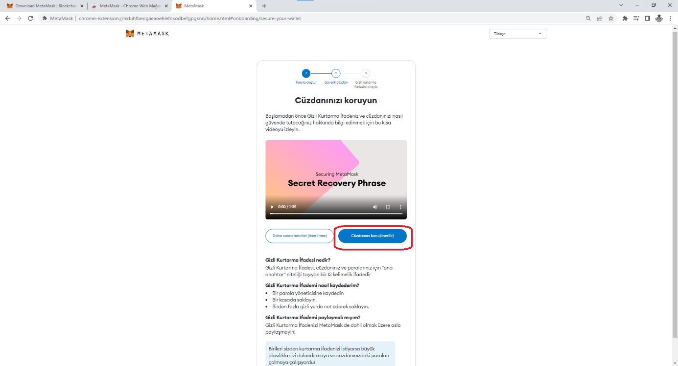 Yeni bir cüzdan oluştur seçeneğini seçtikten sonra karşınıza çıkacak sayfada Gizli Kurtarma İfadelerini görebileceğiniz ve nasıl güvende tutacağınız ile ilgili bilgiler aktarılır. Bunları izlemenizde fayda var. Daha sonra önerilen seçenek “Cüzdanımı Koru” ile devam ediyoruz.