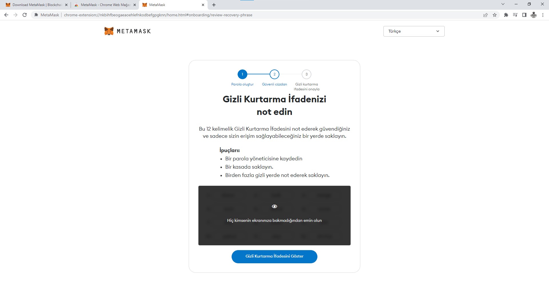 Bu aşamada “Gizli Kurtarma ifadesini göster” dediğinizde size sırasıyla 12 kelimeden oluşan cüzdan kurtarma ve kurulum ifadelerini bulacaksınız. Cüzdanınızdaki parolayı unutsanız bile bu 12 kelime ile istediğiniz zaman sıfırdan kurulum yapabilirsiniz ve içerisindeki hiçbir varlık kaybolmaz. Ayrıca Bu kurtarma ifadeleri ile dünyanın neresinde olursanız olun dilediğiniz bir bilgisayar veya mobilden istediğiniz zaman kurulum yapabilirsiniz. 12 Kelimeden oluşan bu ifadeleri kağıda yazarak not etmeniz tavsiye ediliyor. Dijital ortamlarda saklamak yeteri kadar güvenli olmayabilir.